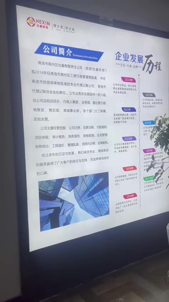 商洛市商州区合鑫有限责任公司主要经营范围:代理记账、申报纳税;并兼顾公司注册登记、变更、注销代理;财务流程设计;财税咨询等。设有专业的财税顾问、主办会计以及工商外勤。 2014年,经商洛市商州区工商行政管理局批准,名为商洛市商州区合鑫有限责任公司正式成立,并经商洛市财政局审核批准为专业代理记账公司。从最开始在商州区中心路小小的几平米小房间扩展到了现在四百多平米的两层办公区,从最初的两个人发展到了现在近五十人的规模,从最开始设有的销售与业务两个部门扩展到现在总经办、销售部、会计事业部、商务部、行政人事部、高端事业部、丹凤分公司、山阳分公司、洛南分公司及子公司-慧达里等,各个部门分工明确,团结友爱,经过10余年的沉淀与发展。我们诚信专业、精准高效的服务赢得了广大客户的信任与支持,在业界享有良好的口碑。
